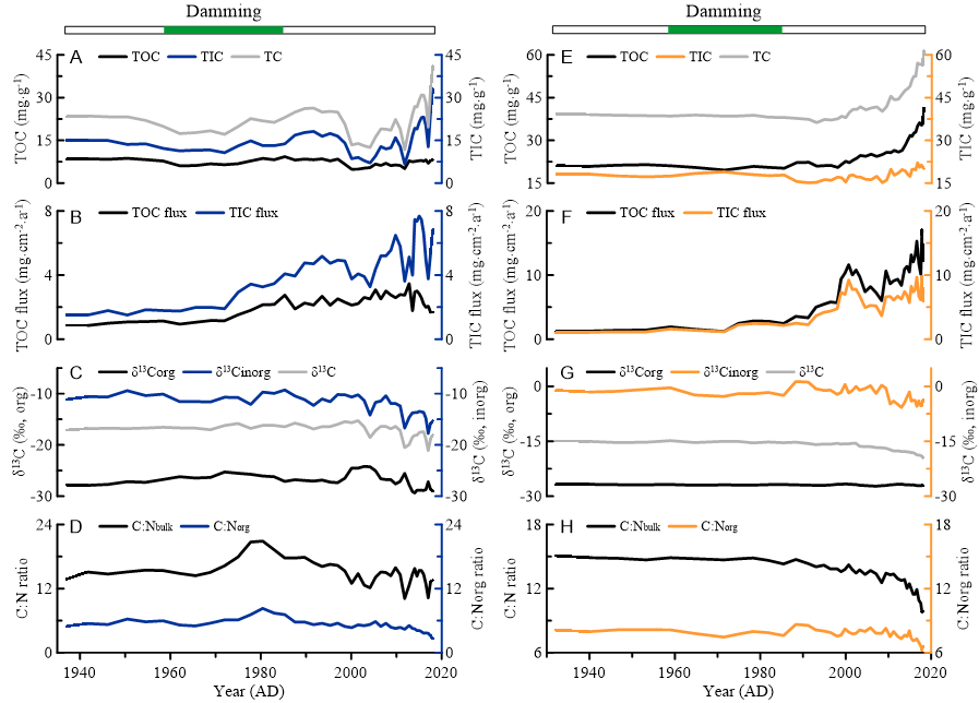 Fig. 3. Time series showing sediment changes in the relative content of TC, TOC and TIC (A, E), flux of TOC and TIC (B, F), δ13C, δ13Corg and δ13Cinorg (C, G), C:N bulk ratio and C:Norg ratio (D, H), in Taiping (A-D) and Sanjiaohai (E-H) lakes, respectively. The period of damming and hydrological regulation is marked by a green bar at the top of each column (1956–1984 CE in Taiping Lake; 1958–1985 CE in Sanjiaohai Lake).
